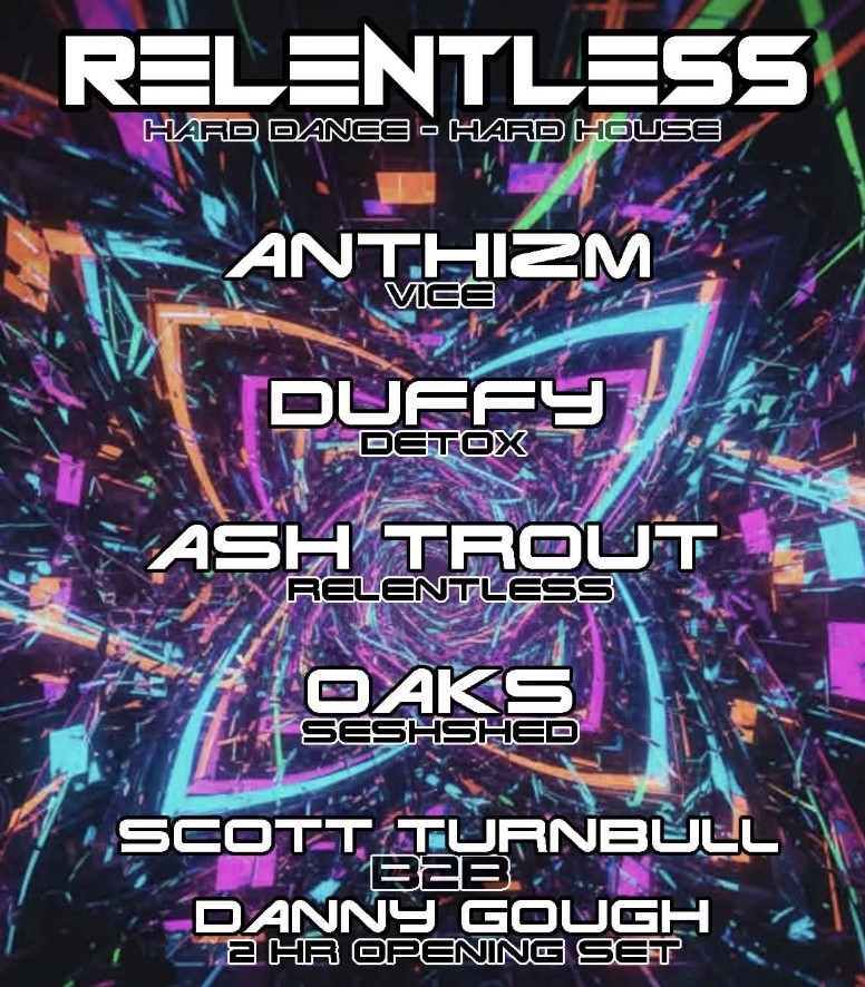 RELENTLESS Opening event … 6 Hours of Hard Dance & Hard House expect full Uv Decor Lazers lights smoke and a massive sounds system to make you dance all night! Full dj line up as follows Anthizm (Vice Club) Duffy (Detox) Ash Trout (Relentless) Oaks (seshshed livestreams) Scott Turnbull B2B Danny Gough (Special 2 hour opening set )