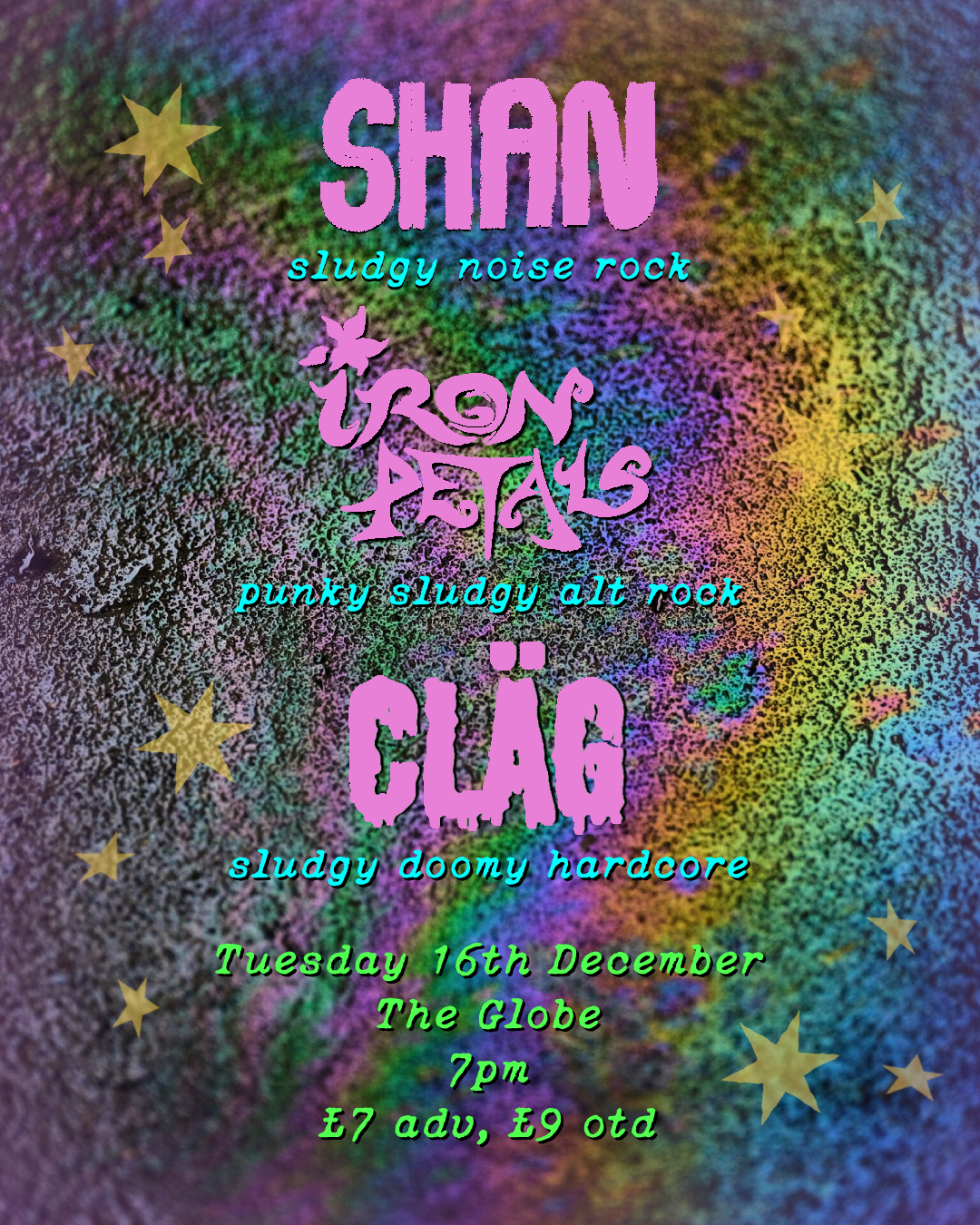 Featuring doomy hardcore elements from openers CLÄG, punky sludge with melodic vocals, (dubbed ‘sugar sludge’) from IRON PETALS, and bringing their own brand of RAW noise and sludgey goodness to top the night off are noise rock duo SHAN.