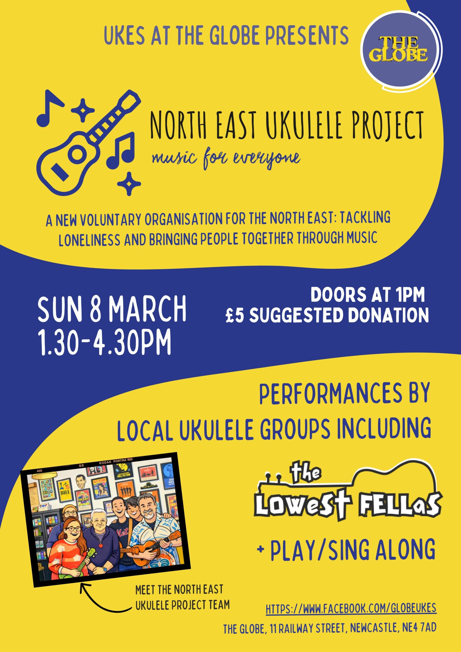 A new voluntary organisation for the North East: Tackling loneliness and bringing people together through music Performances by local Ukulele groups including The Lowest Fellas – Three music making ukulele dads from Gateshead